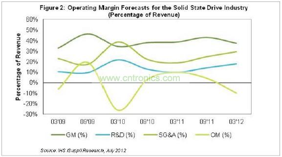 上次SSD产业出现营业利润普遍为负的情况是在2010年上半年,与目前的情形类似。当时,几家厂商加大销售力度,以改善略高于35%的毛利率。这些努力取得了一些效果,2011年中期毛利率自2009年以来首次升到了40%以上。但由于产业竞争加剧和营业费用增加,SSD毛利率在2011年第四季度重新跌至40%以下。