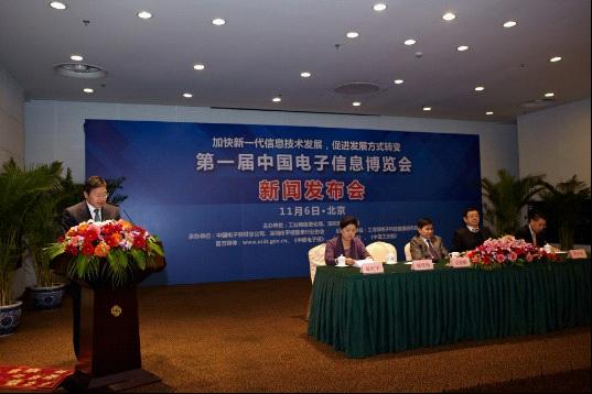 2012年11月6日下午,工业和信息化部与深圳市人民政府在北京召开新闻发布会,宣布2013年4月10日至12日在深圳市共同举办第一届中国电子信息博览会。工业和信息化部电子信息司副司长、中国电子信息博览会组委会办公室副主任安筱鹏出席会议并介绍了筹备举办第一届中国电子信息博览会的总体情况;深圳市经济贸易和信息化委员会副主任、中国电子信息博览会组委会办公室副主任贾兴东介绍了展馆的总体安排;中国电子器材总公司副总经理、中国电子信息博览会组委会办公室副主任兼秘书长陈雯海,深圳市平板行业协会常务副会长、中国电子信息博览会组委会办公室副主任兼副秘书长许生介绍招展的进展情况?;嵋橛晒ひ岛托畔⒒堪旃挛糯ΥΤふ藕煊钪鞒?。新华社、中央人民广播电台、中央电视台、中国电子报、人民邮电报、中国工业报等中央媒体和业内媒体,以及业内相关行业协会和重点企业参加了新闻发布会。