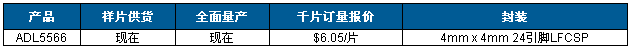 ADL5566采用ADI公司的高速SiGe工艺制造,提供紧凑型4 mm × 4 mm、24引脚LFCSP封装,工作温度范围为−40°C至+85°C。