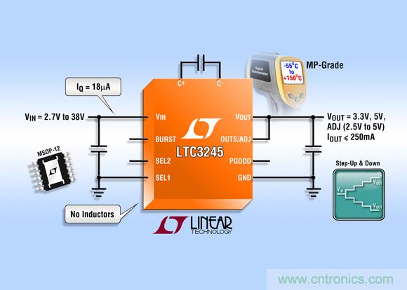 LTC3245 MP 级器件采用具有一个背部散热衬垫的紧凑型 12 引脚 MSOP 封装。千片批购价为每片 7.55 美元,有现货供应。如需更多信息,请登录 www.linear.com.cn/product/LTC3245。