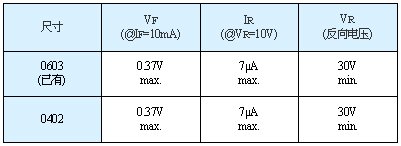 表1:正向电压(VF)等主要电气特性与“0603尺寸”保持同等