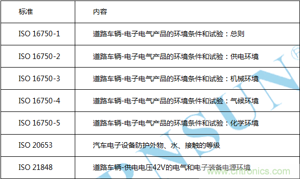 ISO 16750 系列标准是国际标准化组织ISO 最近几年推出的针对汽车电子的环境可靠性标准,该标准是欧系车常用的标准,并且逐渐被世界各国转化为国家标准,也逐渐被各企业标准所引用,成为应用比较广泛的汽车电子的环境可靠性标准。该系列标准包括五个部分: