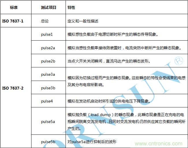 针对汽车电子自身产生的干扰,国际无线电干扰委员会(CISPR)对汽车电子业提出了严格的要求,尤其是车载收音机、数字电视、导航设备都是这种干扰的重灾区。所以 CISPR25:用于?;こ翟亟邮栈奈尴叩缟盘匦缘南拗岛筒馐苑椒?,对汽车电子自身的发射状态也有了明确的等级判定。EMS方面的测试项目如下所示: