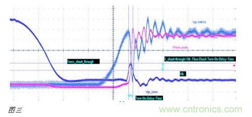测试的目的是看上MOS管导通时,有没有同时把下管打开,从而导致电源直接导通到地而引起短路。如图三所示蓝色曲线(Vgs_Lmos)就是下管在上管导通的同时,被带了起来,如果蓝色曲线的被带起来的尖峰超过了MOS管的Vth要求,同时持续时间(Duration)也超过了datasheet要求,从而就会有同时导通的风险。当然,这是大家最常见到的情况。