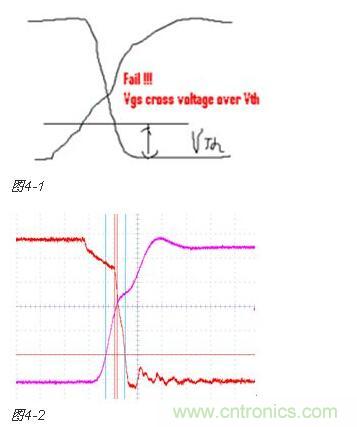 下面这种情况有非常多的人会忽视,甚至是一些比较有经验的电源测试工程师。下面组图四是下管打开,上管关闭时候的波形(图4-1是示意图,图4-2示实际测试图)。虽然没有被同时带起的情况,但是请注意上下管有交叉的现象,而且交叉点的电平远高于MOS管规定的Vth值,这是个严重的shoot through现象。最直接的后果就是MOS管烧毁!
