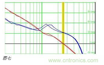 我们有可能会看到的相位裕量不能达到要求。如下图七,只有30度左右。这个时候,只有调试不同的参数,才能得到比较好的结果。从而满足系统稳定性的要求。
