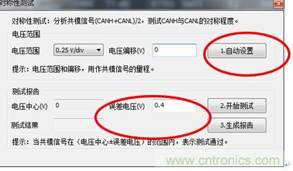 注意:由于GMW3122规定CANH+CANL的电压要在4.2V~5.8V,而正常为5V。所以在采用对称性测试时,其中使用的是(CANH+CANL)/2进行判别。 所以标准范围为2.1V~2.9V,正常为2.5V。因此图7中误差电压需要填入0.4。