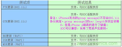 从测试结果可以看出,iPhone 4的GTK更新报文并不符合802.11i协议的规定,对group message2的key length域错误的进行了赋值。H3C设备由于对此采用了宽进严出的原则,可以很好的进行兼容。这一点也体现出手机终端兼容性测试的重要性。