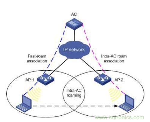 AC内漫游(Intra-AC roaming):一个无线终端从AC的一个AP漫游到同一个AC内的另一个AP中,即称为AC内漫游。如图1所示。