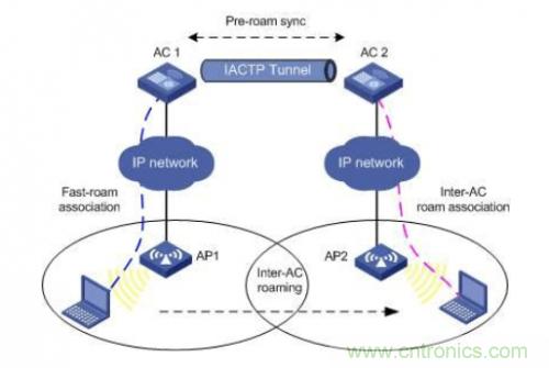 AC间漫游(Inter-AC roaming):一个无线终端从AC的AP漫游到另一个AC内的AP中,即称为AC间漫游。如图2所示。