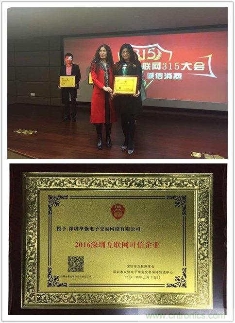【导读】“3.15”是国际消费者权益日,当天下午,2016深圳互联网315大会在中国(深圳)新媒体广告产业园举办。大会现场颁发了深圳“可信企业”验证3项大奖,深圳华强电子交易网络有限公司获奖,成为5家“2016深圳互联网可信企业”之一。