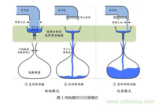图 1形象的诠释了传统模式和记录模式的区别;当信号流很大时,直接存到细口瓶肯定溢出,只能先存到宽口瓶,存满后先停下来,再慢慢传回细口瓶;当信号流不大时,宽口瓶充当传输管,将信号流直接引入细口瓶,可长时间不间断存储。