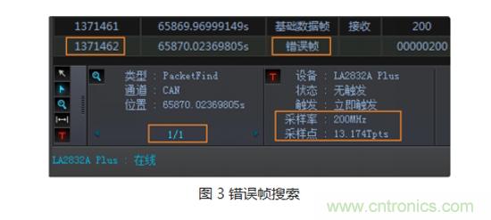 这个大可放心,通过强大的搜索或过滤功能,进行“错误帧”定位。不用几十秒,就完成了100多万帧数据的排查,并发现定位一个错误帧(1371462帧),如图 3所示。