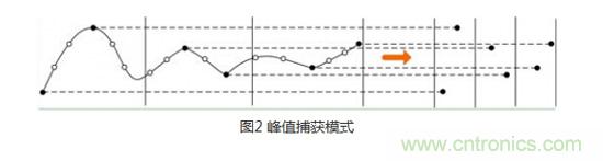 接下来就是峰值捕获模式,看着名字就知道是什么意思了,就是采集一个采样间隔信号中的最大值和最小值。