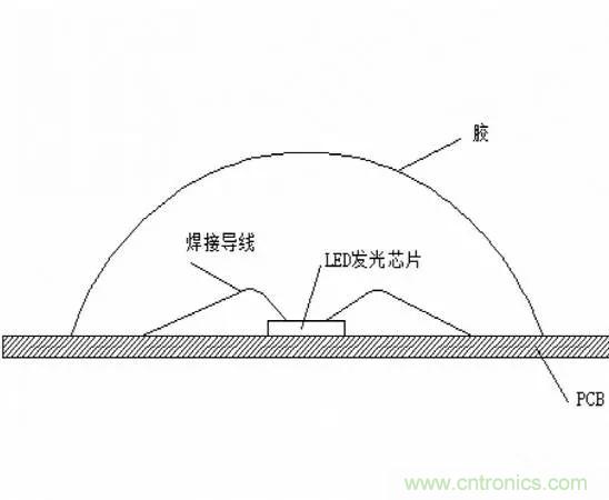 COB封装,是英语Chip On Board的缩写,直译就是芯片放在板上。 是一种区别于DIP和SMD封装技术的新型封装方式。如图所示