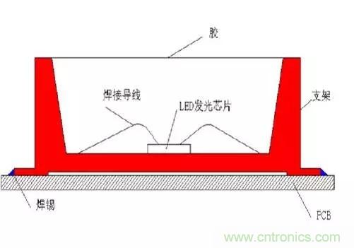 众所周知,回流焊炉内一般会有240°的高温。如果环氧树脂胶TG点过低,或封装过程有潮气吸入,高温会导致胶体非线性急剧膨胀,导致LED芯片焊线拉断破坏失效。另外高温会通过支架管脚将热量快速传导到芯片,造成芯片体龟裂碎化失效的可能性增加。而这种问题是最可怕的,一般在工厂老化测试时也不会出现问题,经过运输到客户端再使用一段时间问题就会逐步暴露出来。