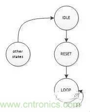 CPLD其内部没有RAM,这样就不能依靠RAM的初始化数据来产生可靠的复位;从原理上说,器件上电后,其寄存器的状态是不确定的,因此我们是没法得到一个确定的初始状态去产生一个可靠的内部复位信号,不过我们还是可以产生一个有一定失败概率但概率可控的复位信号,其基本原理是:设计一个n位的状态机,见下图,其中一种状态表示复位结束(记为LOOP),只要进入该状态就会一直保持在LOOP状态上,至于其他状态都会跳入复位状态(记为RESET),RESET状态是暂态,一个时钟周期就离开进入LOOP状态;由于状态LOOP出现的概率仅为:1/2n,我们控制n的长度,就可以将复位失败概率控制在设定的要求内。