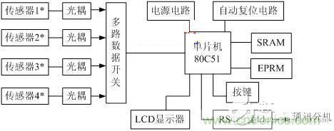 压力测量控制系统的结构如图1所示, 它以80C51单片机为核心, 包括传感器、光耦、多路数据开关、LCD液晶显示器、SRAM, EPROM、自动复位电路、RS-485接口电路及高效电源电路等。下面分别介绍一下它们各自的设计特点。