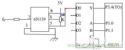 由图2看出,传感器频率信号是通过光电耦合器6N139耦合到74HC151的输入引脚D0。80C51的P1.0, P1.1输出控制码,选择D0--D3输入中的一路,用单片机的T0测信号频率。