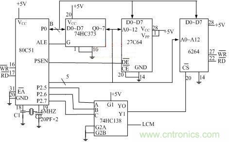 在80C51单片机中,外部I/O口是作为外部RAM来扩展的,选址的方法与扩充外部RAM的方法完全相同。本电路除了外部的RAM外,还有LCD显示器作为外部I/O器件,因此,只采用线选址方式是不够的,应采用译码选址方式。