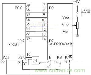 LCM点阵式液晶显示??槟芟允镜淖址啵⑶夷芟允竞鹤?,因而在智能化测量控制仪表中得到了广泛的应用。本系统选用的是EPSON公司生产的EA-D20040AR点阵式液晶显示???,它由TN型液晶显示器、CMOS驱动器和CMOS控制器组成,??槟诩捎凶址⑸骱褪荽嬷?,采用单±5V电源供电,内部有能显示96个ASCII字符和92个特殊字符的字库。EA-D20040AR与单片机80C51的接口电路如图4所示: