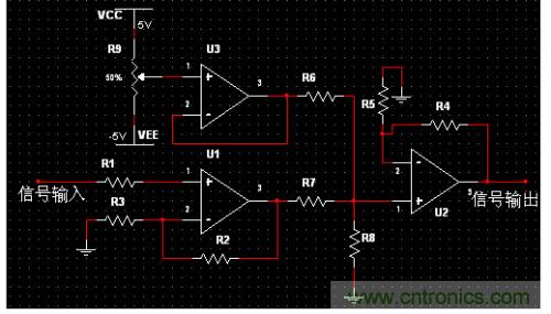 R1,R2分别由一个模拟开关CD4051来连接不同的电阻,不同的R1,R2通过公式:这样就可以实现程控放大功能了??傻鞯缱鑂9用来设置信号调理电路加入的直流分量的大小。放大后的信号和直流分量最后由U3模拟加法器叠加后输出。