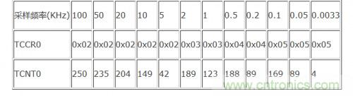 ADC的采样频率在上文已有提及,ADC中断的计算公式为:,通过ATmega16的特殊功能寄存器TCCR0的低3位CS02,CS01,CS00的设置就可以改变的频率,再把TCNT0设置成不同的数值就可以得到这个系统所需要的各个采样频率值了。表1中的数据是通过上面的公式计算出来的数据再经实际的系统调试并修正后的数据。
