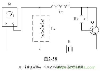这里顺便说明,采用图2-54测试时应该注意的地方。图2-54中,隔离电感LT的大小要求是测试电感Lx数值的3倍以上,并且测量高压包初级线圈的初始电感值L0时,最好也要接入电路之中。这里,隔离电感LT可选取20毫亨以上的带矽钢片铁芯的电感,电感的铁芯要留有一定的气隙;电流源可用一个稳压电源与一个大功率电阻串联代替,如图2-57;或用一个稳压电源与一个大功率晶体放大器串联来代替,如图2-58。