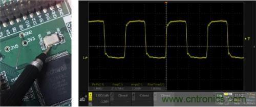 以晶振信号测量为例,如图1所示为常规的鳄鱼线接地测量方法,可看到信号过冲严重伴随振荡,和想像中的方波不一样。而图2所示的短地线弹簧接地测量方法,波形端正不少,显然资深工程师的方法没错。
