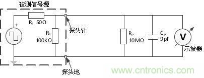 且看图解,如图3所示为示波器使用探头进行信号测量理论上的等效模型。探头与示波器组成具有一定输入电阻和输入电容的测试设备;被测量信号等效为具有一定内阻与工作负载的源。