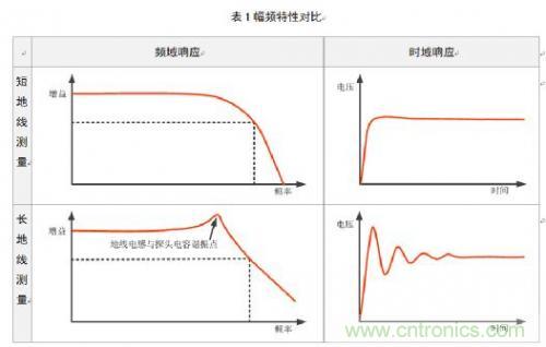 谐振点在频域及时域的影响如表1中所列图示。其中短地线(弹簧地)测量用图3所示模型分析;长地线(鳄鱼线)测量用图4所示模型分析。