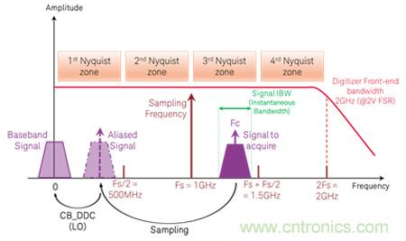 在数字化仪中,您可以考虑选择超过采样率(fn)一半的带宽。有时可以通过欠采样(undersampling)和特殊输入滤波来捕获大于 Fs/2 的频率。例如,是德科技的 M9203A 和 M9703B 数字化仪支持 2 GHz 带宽,ADC 采样时钟速率为 1.6 GS/s,允许使用欠采样直接进行下变频。