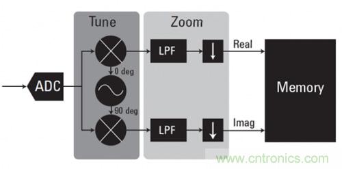 数字化仪采用诸如零抑制(zero suppress)等数据压缩技术,只保留超过给定阈值的相关信号。它们还使用数据打包和四舍五入来优化可用存储器空间。也使用诸如数字下变频(DDC)等实时数据压缩技术。DDC 直接在 ADC 数据上进行数据的频率转换和抽取。图 3 中的框图显示了其基本原理。捕获到复杂的 IQ 数据,可以使中心频率下变频到 0 Hz。然后使用滤波和数据抽取来去除不需要的频率分量,缩减所需数据的大小。在对宽带采集中的一小段频谱进行分析时,DDC 非常有价值。DDC 不仅可以减少所需的存储空间,而且可以降低宽带综合噪声,改善整体信噪比(SNR)。