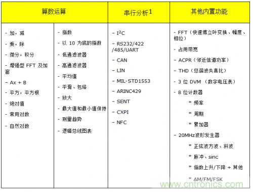 ·测量和分析。示波器针对易用性和测量速度进行了优化。它们的硬件中内置了各种测量和分析工具。如果是台式示波器,用户可以从台式仪器的前面板访问这些测量和工具,如果是模块化仪器,用户可以从软件前面板访问。这使得示波器非常适合用于在设计或故障诊断期间进行的各种常见测试。由于测量在硬件中执行,因此可以快速获取结果,缩短测试台或 ATE 环境的测量时间。以下所示为 InfiniiVision 系列示波器中提供的一些算数运算、FFT 和串行协议分析工具。
