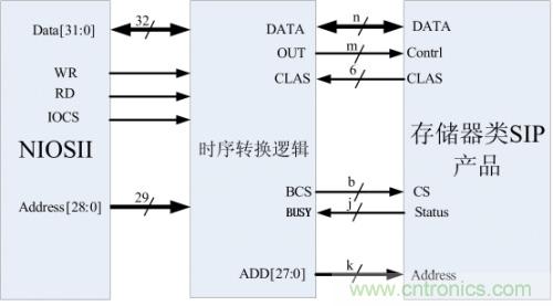 此设计方案根据上述各种存储器独自的读写时序访问特性,通过FPGA的灵活编程特性,适当地调整NIOSII的外部总线时序,最终实现基于NIOSII的外部总线访问各种存储器读写时序的精确操作。如图2-1。通过FPGA自定义一个可以挂载所有存储器芯片的总线接口-ABUS,如表1。而且在同一个接口上能够自动识别各种接入的被测试存储器芯片,它们通过类别输入信号(CLAS)来区分,每一种存储器芯片对应一种独特的操作时序。下面是几种存储器芯片的接口连接方式及信号描述。其它的存储器芯片都可以用类似的接法挂载到ABUS总线上,最终完成测试。