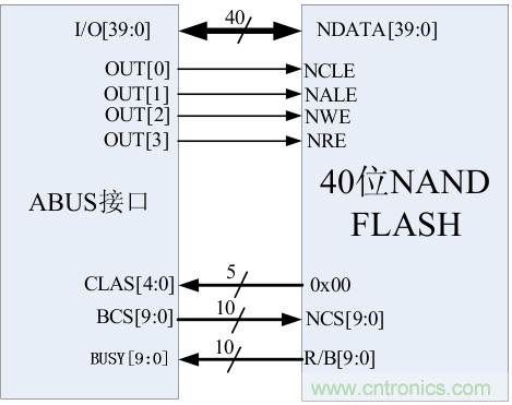 如表2,详述了40位NAND FLASH与ABUS的连接关系。