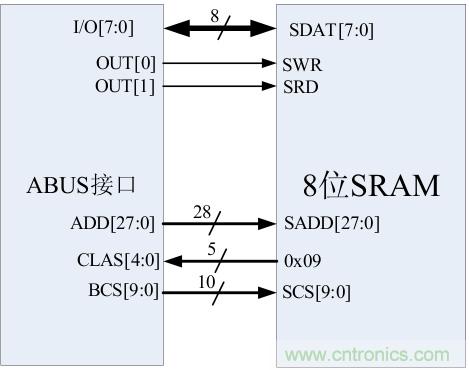 8位SRM??橛隢IOSII通过ABUS(FPGA)连接,实现正确的时序读写操作。如图2-5。表5是信号连接说明。