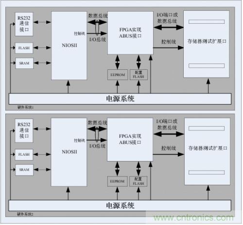 在测试NAND FLASH时,测试时间长达十个小时不等。在此为提高测试效率,增加测试速度,本设计采用两套完全一样且独立的硬件系统构成??赏弊疃嗖馐?片NAND FLASH器件。每一个硬件系统由一个微处理器(NIOSII)加一个大容量FPGA及一个存储器测试扩展接口(即ABUS接口)三大??楣钩?。如图3-1。RS232通信接口实现测试系统与上位机的数据交换,完成人机交互操作。电源系统产生各种合适的电压,满足各芯片的电源供给。