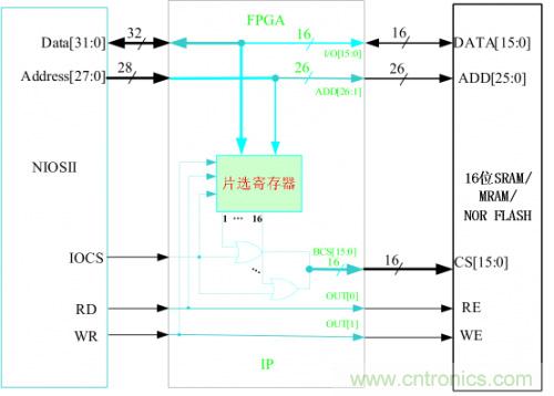 如图4-2,SRAM、MRAM和NOR FLASH的接口操作基本一致,NIOSII的总线时序完全满足。故在FPGA内部只要简单的把相应的控制线和数据线相连就可以了,唯独只要设计一个片选寄存器,用来区分SIP的16个片选。每一个片选可以访问的空间为128MByte。片选寄存器的地址为(基址+0x0FFFFFFC),基地址设在NIOSII 外部总线的最高地址位。