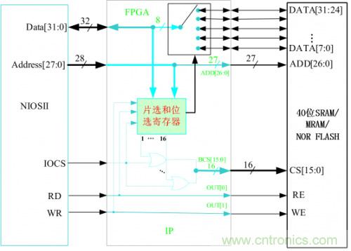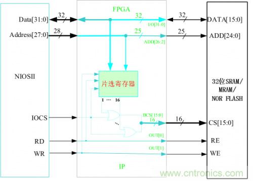如图4-3,SRAM、MRAM和NOR FLASH的接口操作基本一致,NIOSII的总线时序完全满足。故在FPGA内部只要简单的把相应的控制线和数据线相连就可以了,唯独只要设计一个片选寄存器,用来区分SIP的16个片选。每一个片选可以访问的空间为128MByte。片选寄存器的地址为(基址+0x0FFFFFFC),基地睛设在NIOSII 外部总线的最高地址位。