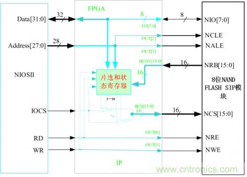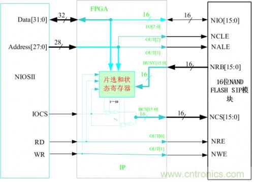 16位的NAND FLASH存储器芯片可以有多种组合方式,可以用多个16位的NAND FLASH组合,也可以用多个8位的NAND FLASH组合。这里我们假设16位的SIP NAND FLASH产品是由多个16位的NAND FLASH组合而成,下面的IP核是根据它的结构来设计的。