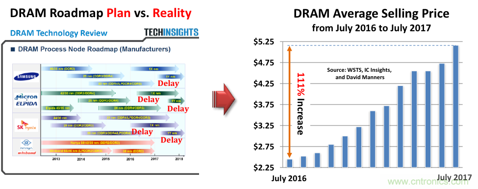 图1:DRAM发展蓝图的计划与现实。(来源:WSTS、IC Insights、David Manners)