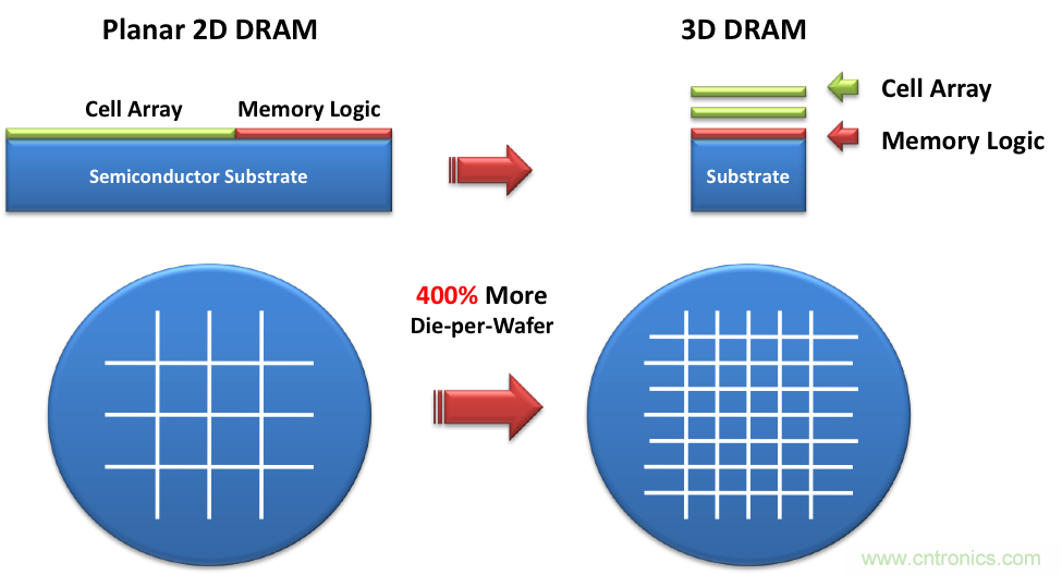 图2:3D DRAM可让每片晶圆切出更多的芯片与低成本DRAM。