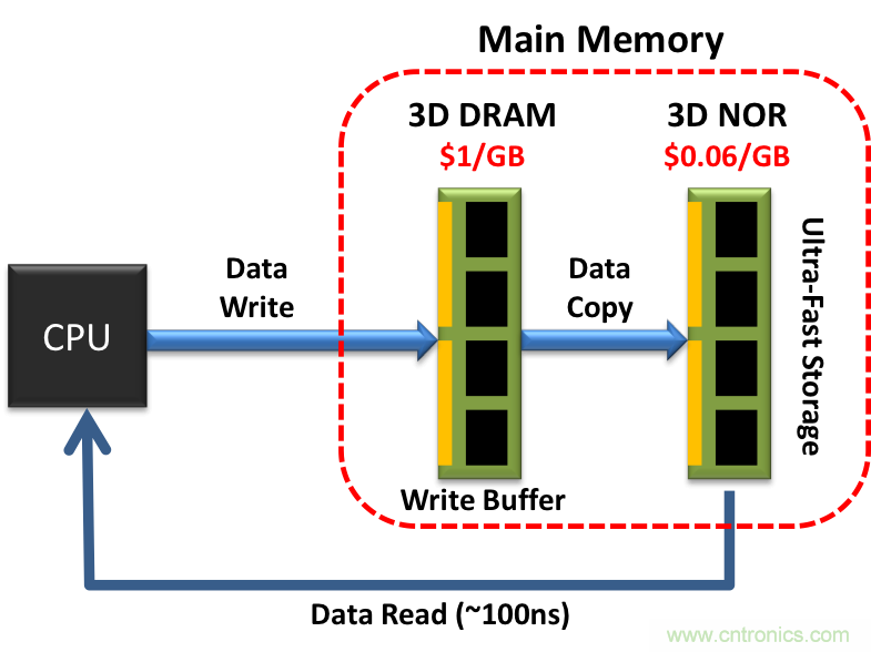 另一项建议是采用DDR4 NVDIMM,以取代DRAM作为主存储器。非挥发性双列直插式存储器???NVDIMM)有很多种类型;相较于其他以储存为导向的NVDIMM,DDR4 NVDIMM能够表现得和DRAM一样快,而且可以作为主存储器。几年前,英特尔的3D XPoint看好DDR4 NVDIMM作为切入点,因为3D XPoint拥有NOR型闪存读取延迟低(低于100ns)的优点,因而能像DRAM一样快速运作。它也不需要预测软件,因而能够始终保持高性能。此外,采用单层储存(SLC)的SLC NOR闪存具有很高的耐久性。因此,DDR4 NVDIMM的NOR闪存能够取代DRAM,并以大量的主存储器大幅提升系统性能,如图3所示。