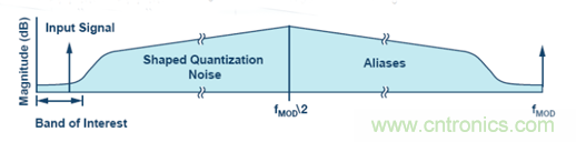 一般而言,对于特定的目标频段,每 2 个过采样系数就会使动态范围改善 3 dB(假定为白噪声频谱)。Σ-Δ 型转换器的第二个优势是噪声传递函数。它将噪声整形至更高频率(如图 2 所示),进一步降低了目标频段内的量化噪声。
