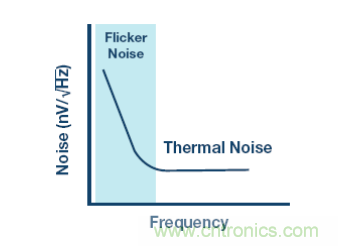 集成输入缓冲器还有其它挑战。Σ-Δ 型调制器可在低频率时提供极低噪声,但所有其它元件(比如输入缓冲器)都会使热噪声增加,而更严重的则是低频闪烁噪声,如图 4 所示。