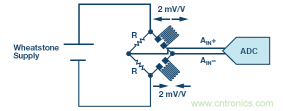 在惠斯登电桥中,共模电压由连接两个桥臂的阻抗决定,且与施加的电源成正比。电子秤应用即采用这种检测拓扑,因为它具有针对应变计的线性检测优势;图 8 显示了一个半桥式 II类电路。