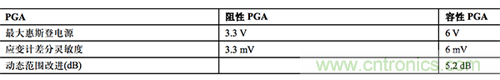 表 1. 惠斯登电桥中的阻性 PGA 和容性 PGA 对比(假设使用标准电源和增益)
