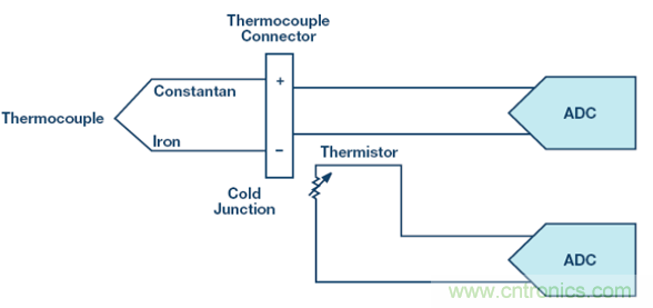 为了增加温度测量的精度,建议采用四线式测量。本例中,只使用了一个电流基准。为了避免电流源的不精确性,可以将精密电阻用作 ADC 基准电压发生器来进行比例测量,如图 11 示。