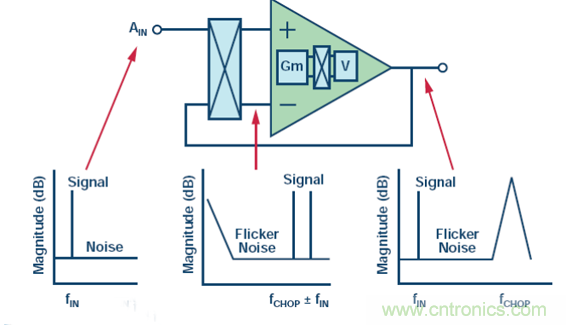 对输入进行斩波之后,输入频率便调制到较高频率。缓冲器失调和闪烁噪声依然保持其最初的低频率,因为它们不受输入斩波的影响。